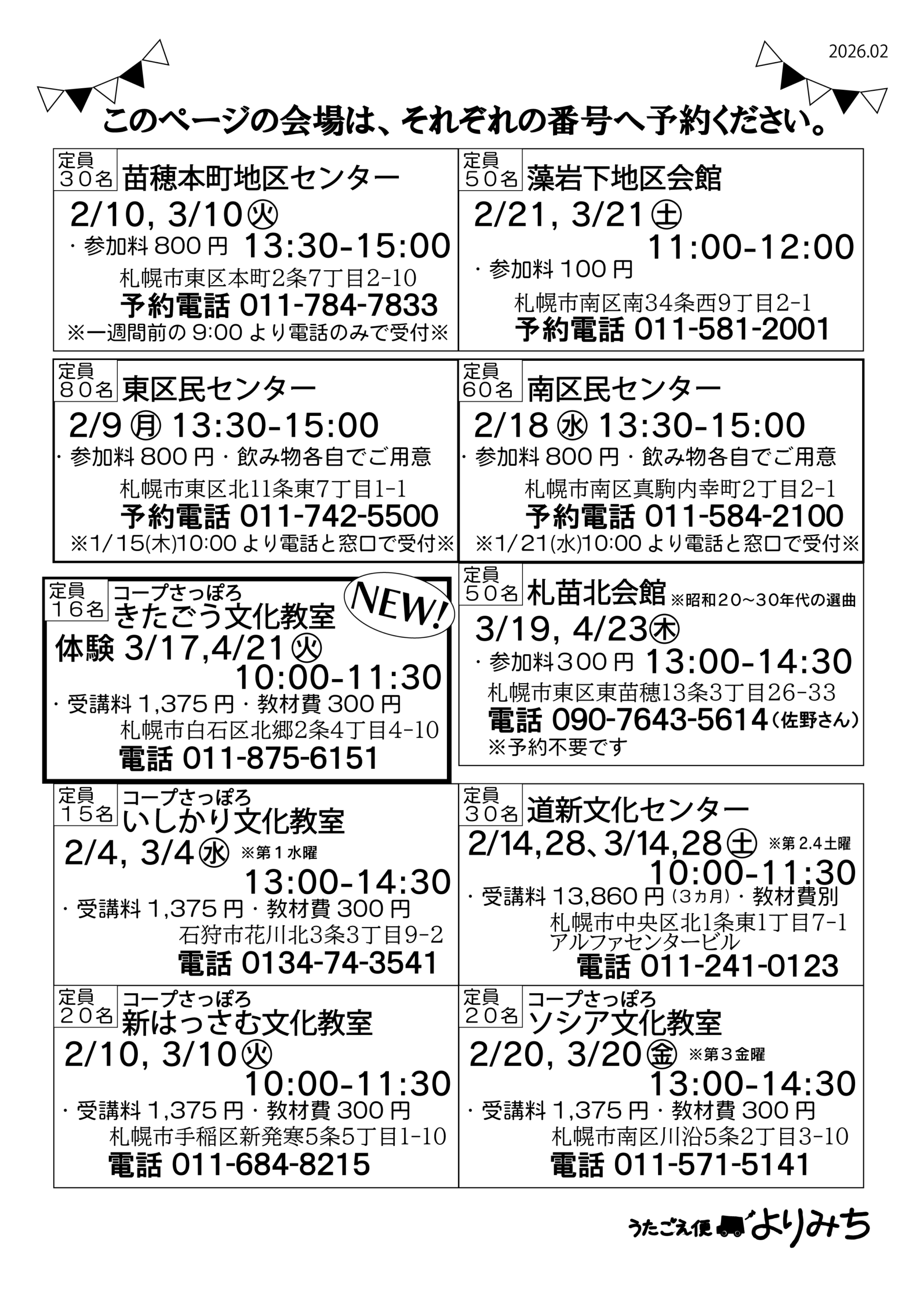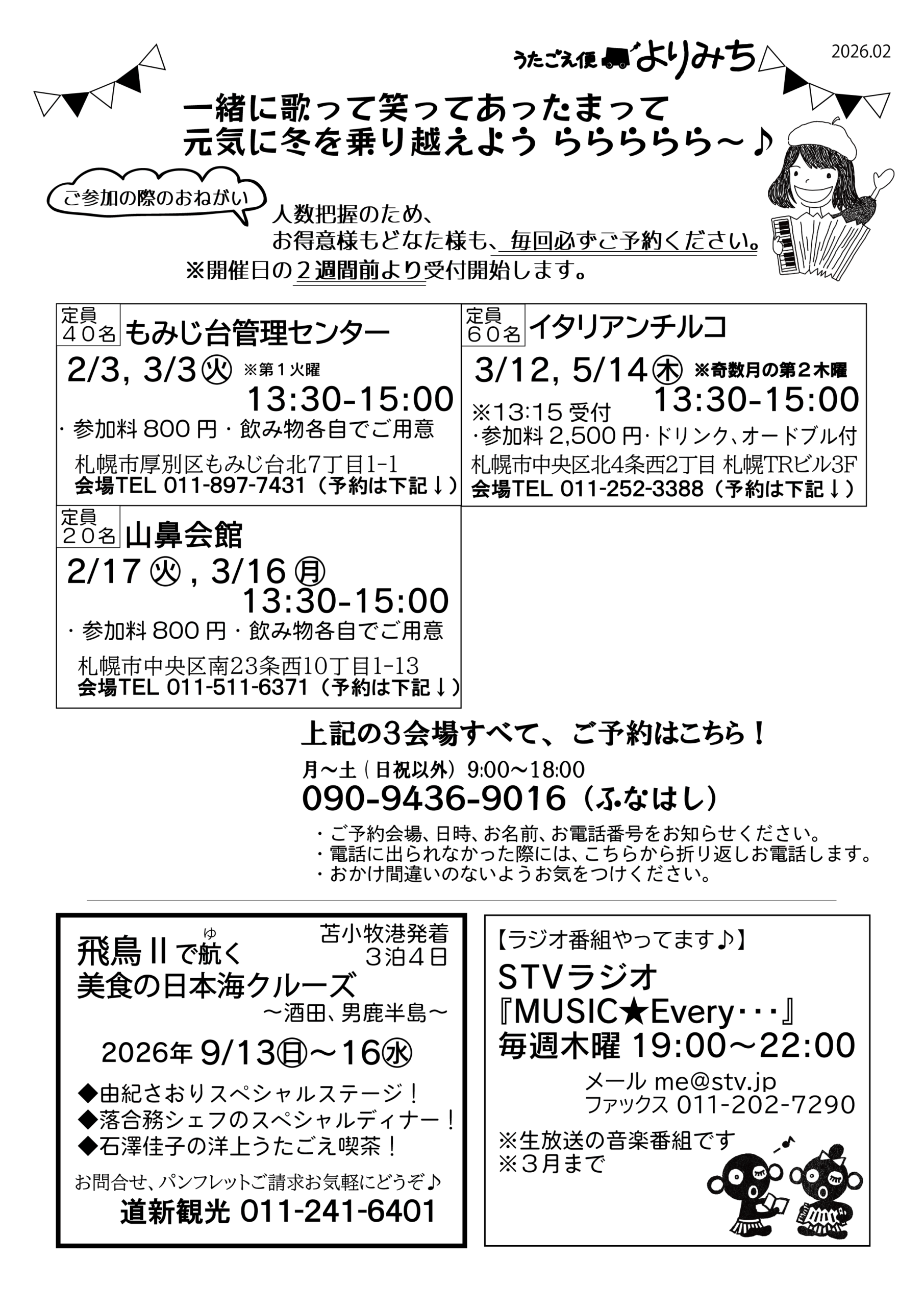 おはようございます。 よりみちよっちゃんです。 あっという間に新年2か月目に突入ですね。 時間と追いかけっこしているみたいな毎日ですが、 元気いっぱい笑顔いっぱいあっちこっちへよりみちしまーす♪ どうぞ足元にお気を付けてご参加くださいませ。 ♪2/3/(火)13:30-15:00 もみじ台管理センター ♪2/4日(水)13:00-14:30 コープいしかり文化教室 ♪2/6(金)14:00-15:00 ライフコート西宮の沢 ♪2/9(月)13:30-15:00 東区民センター ♪2/10(火)10:00-11:30 コープ新はっさむ文化教室 ♪2/10(火)13:30-15:00 苗穂本町地区センター ♪2/12(木)10:00-11:00 青葉町ふれあい交流事業 ♪2/13(金)14:00-15:00 ライフコートガーデン南館 ♪2/14(土)10:00-11:30 道新文化センター ♪2/15(日)10:30-11:30 北野団地シルバー会 ♪2/16(月)10:00-11:30 創造学園サンキュー会 ♪2/16(月)14:00-15:00 ライフコート西野 ♪2/17(火)13:30-15:00 山鼻会館 ♪2/18(水)10:00-11:00 青葉町ふれあい交流事業 ♪2/18(水)13:30-15:00 南区民センター ♪2/19(木)10:00-11:00 青葉町ふれあい交流事業 ♪2/19(木)13:00-14:00 青葉町ふれあい交流事業 ♪2/20(金)10:00-11:30 アベニュー16 ♪2/20(金)13:00-14:30 コープソシア文化教室 ♪2/21(土)11:00-12:00 もいわ下地区会館 ♪2/22(日)13:30-15:00 イニシアグラン札幌苗穂 ♪2/25(水)10:00-12:00 南新川町内会 ♪2/28(土)10:00-11:30 道新文化センター 以上23件 そして。 イタリアンチルコで 2/6(金)、13(金)、21(土)、27(金)の19:00頃から演奏します♪ イタリアンCIRCO(チルコ)予約電話:050-5868-0220 札幌市中央区北4条西2丁目 札幌TRビル3F ========================== ラジオ出演 ========================== 毎週木曜日19:00〜22:00 STVラジオ『MUSIC★Every・・・』3時間の生放送です♪3月まで。 春が待ち遠しいですね。 雪かきとか移動とかいろいろ大変ですが、なんとか無事に元気に乗り越えられますように♪